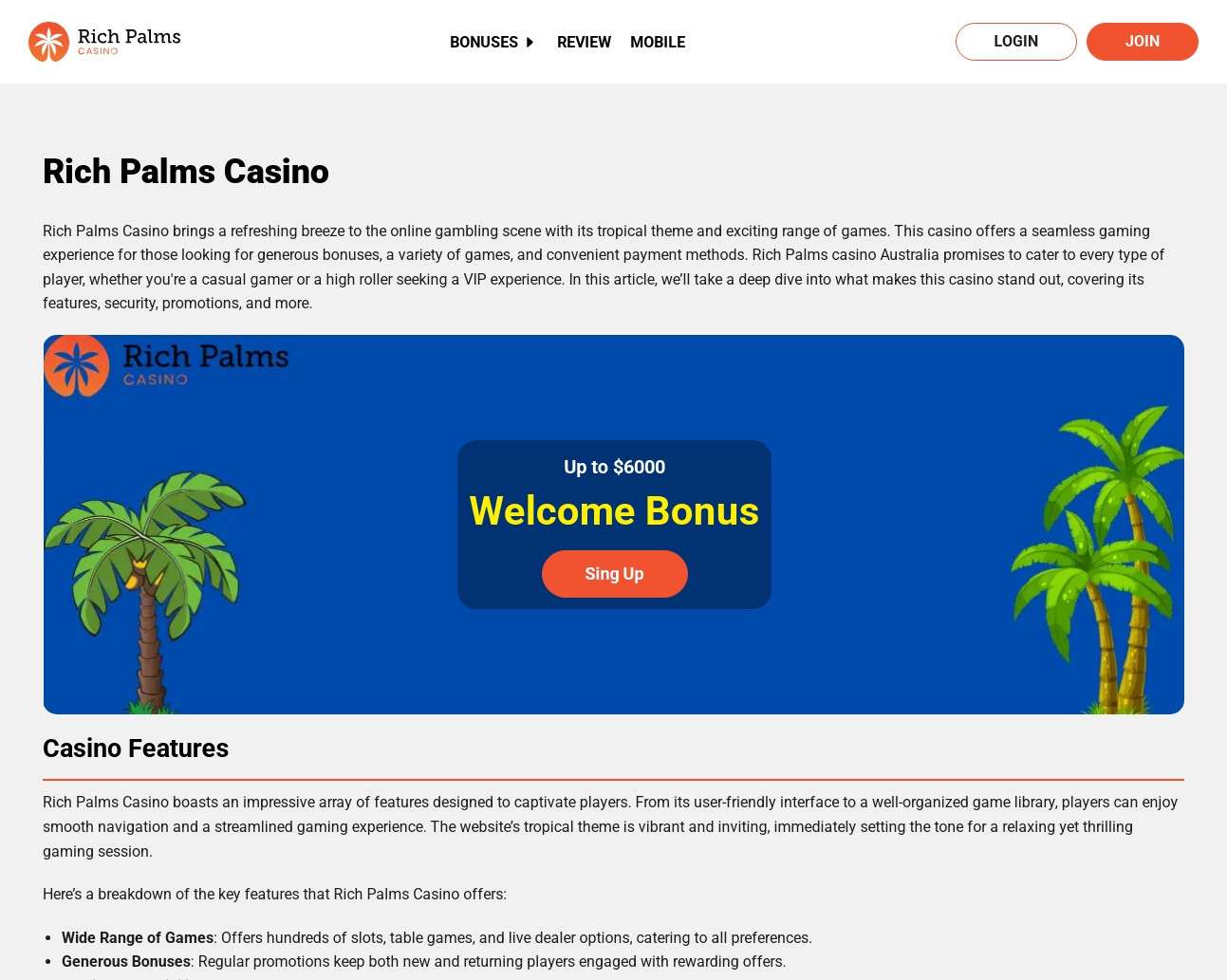 The cellular on line casino expertise at Wealthy Palms is designed to supply Australian gamers a handy, safe, and pleasant gaming surroundings. With its in depth recreation choice, engaging promotions, and glorious buyer assist, it’s no shock that Wealthy Palms is a most well-liked selection for a lot of cellular players.